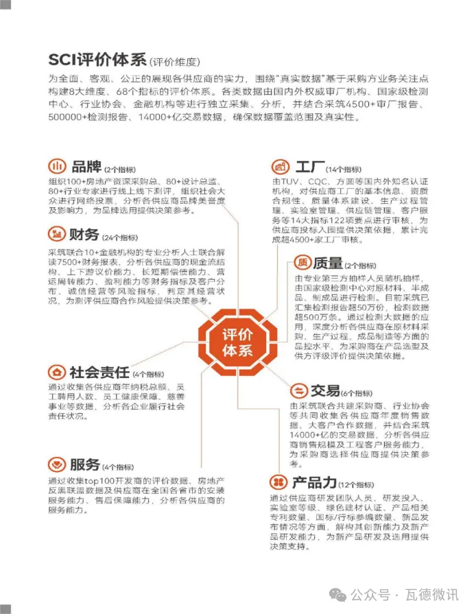 2024年,采筑供應(yīng)商綜合指數(shù)SCI全面升級(jí):1、測(cè)評(píng)模型優(yōu)化:新增了政府平臺(tái)、國央企采購商關(guān)注的綠色工廠、綠色建材、綠色供應(yīng)鏈等測(cè)評(píng)指標(biāo);2、測(cè)評(píng)范圍擴(kuò)大:本次測(cè)評(píng)涵蓋91個(gè)品類,2600多家供應(yīng)商參評(píng),測(cè)評(píng)的供應(yīng)商數(shù)量增加50%,測(cè)評(píng)范圍也從供應(yīng)商擴(kuò)展到與之相關(guān)的經(jīng)銷商、安裝商;3、升級(jí)并開放SCI智能測(cè)評(píng)系統(tǒng):可支持采購方自由選擇關(guān)注的指標(biāo)及算分規(guī)則,為客戶提供根據(jù)自身需求定制的評(píng)估模型,快速生成評(píng)分;4、采信范圍擴(kuò)大:采筑聯(lián)采資信標(biāo)采信SCI測(cè)評(píng)得分,更多的采購商客戶通過采信SCI測(cè)評(píng)數(shù)據(jù)進(jìn)行品牌庫建設(shè)。二、SCI三大特點(diǎn):無濾鏡、無雜質(zhì)、無廣告SCI評(píng)價(jià)資料真實(shí)。測(cè)評(píng)資料來自房地產(chǎn)商、設(shè)計(jì)院、建筑單位、檢測(cè)機(jī)構(gòu)、金融機(jī)構(gòu)、供應(yīng)商、第三方數(shù)據(jù)平臺(tái)等渠道,覆蓋整個(gè)產(chǎn)業(yè)鏈。SCI基于評(píng)價(jià)模型對(duì)資料進(jìn)行比對(duì)和甄別,提升資料的真實(shí)可靠性。SCI評(píng)價(jià)數(shù)據(jù)豐富。4500多份供應(yīng)商審廠報(bào)告、50萬余份產(chǎn)品檢測(cè)報(bào)告、7500余份財(cái)務(wù)報(bào)表,200多家共建單位線上線下專項(xiàng)測(cè)評(píng)、上萬大眾參與投票。三、全行業(yè)強(qiáng)推,SCI勢(shì)不可擋采筑將SCI評(píng)價(jià)內(nèi)容與行業(yè)權(quán)威機(jī)構(gòu)的供應(yīng)鏈管理成果充分結(jié)合,輸出2024《采筑建材行業(yè)指南》,為行業(yè)提供一份客觀公正,能快速摸清產(chǎn)品力風(fēng)向,全方位了解供應(yīng)商實(shí)力的供采合作指導(dǎo)工具書,輔助采購商客戶準(zhǔn)確、快速?zèng)Q策,佐證供應(yīng)商綜合實(shí)力。
